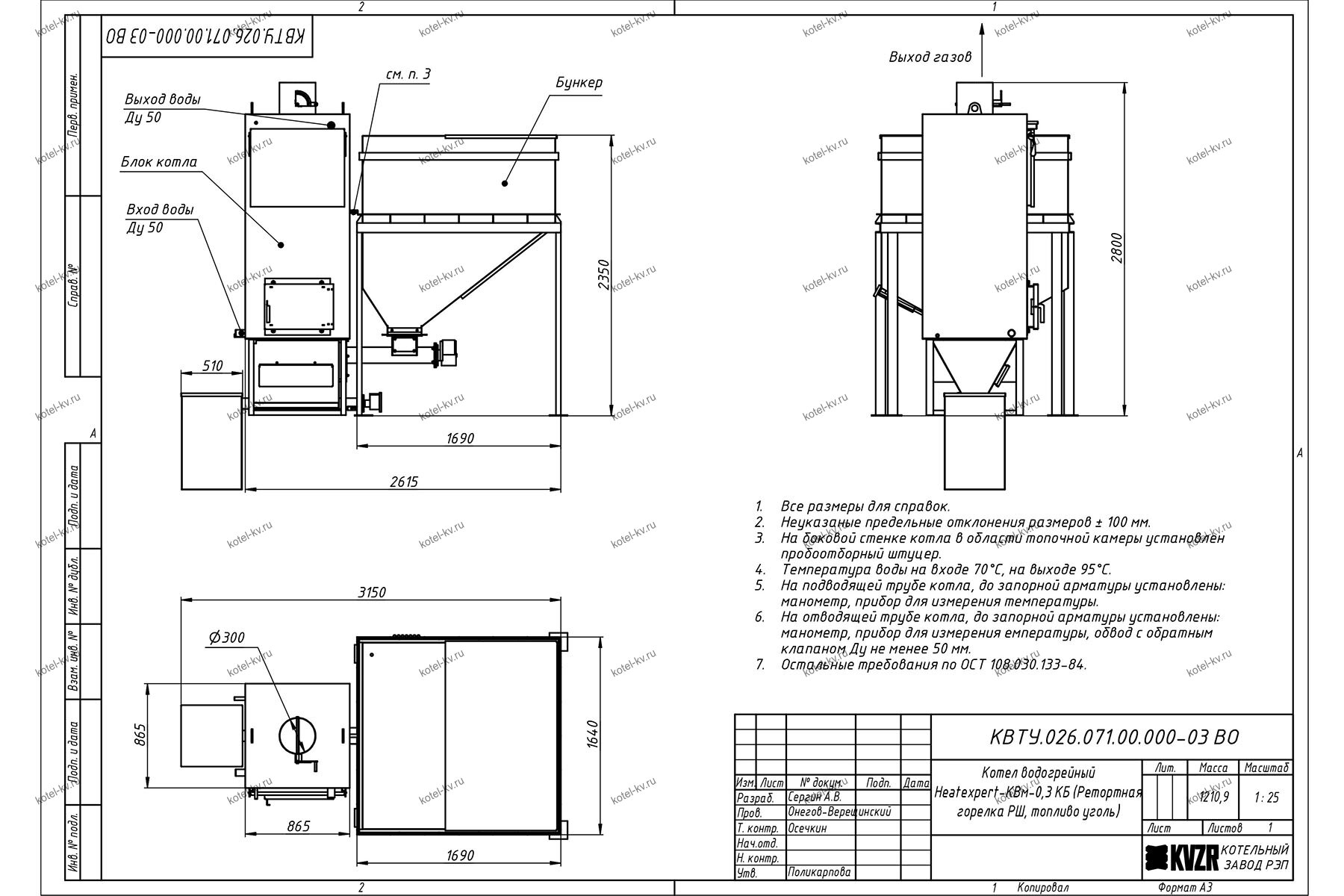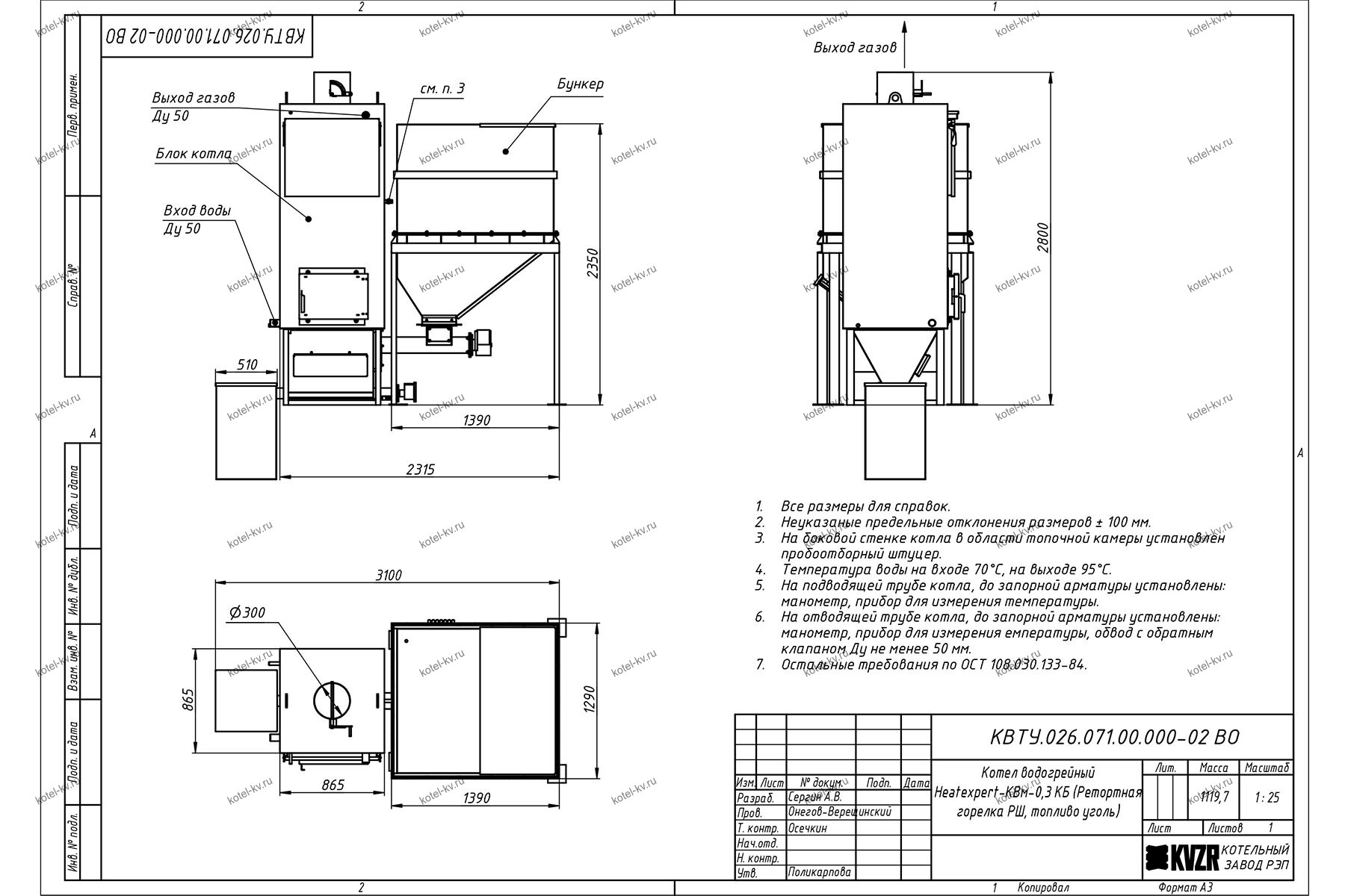 Угольный котел 0.3 МВт с автоматической подачей конструктивно состоит из следующих блоков: